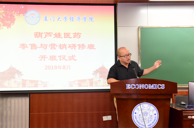 在开班仪式上,廖景峰主任首先代表厦门大学经济学院热烈欢迎星空真人医药零售与营销研修班的学员到厦大学习,并就厦门大学及经济学院的相关情况进行了介绍。他说,星空真人学员走进厦大就是厦大的校友,希望未来的日子能够关心、支持母校的发展,多提宝贵意见,同时他也祝大家在厦大学习期间学有所成、学有所获。